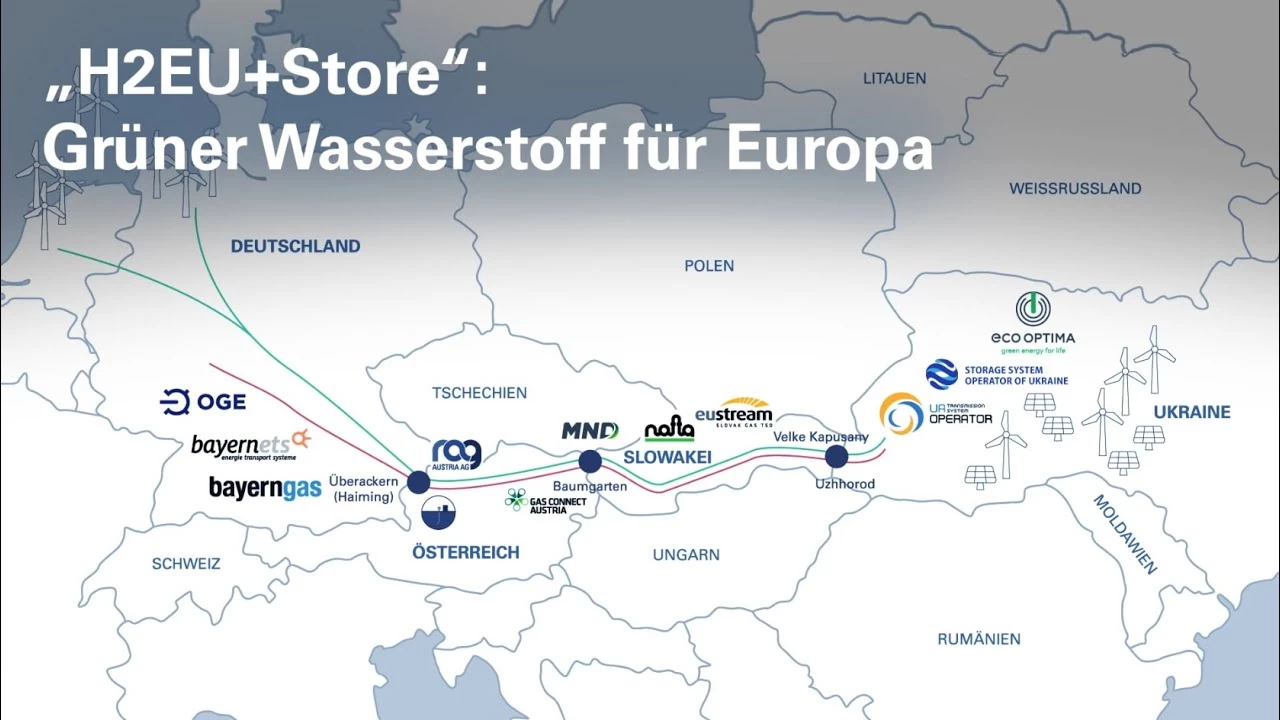 Darüber hinaus verfolgt die Industriepartnerschaft „H2EU+Store” den unumgänglichen Ausbau der Wasserstoff-Speichervolumina (sowohl für den Produktionsausgleich als auch für den saisonalen Bedarf) sowie Adaptierungen im Bereich des Gastransports von der Westukraine nach Zentraleuropa.